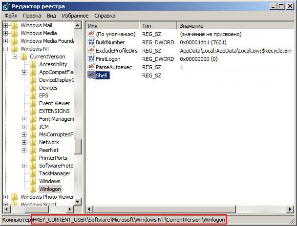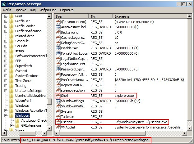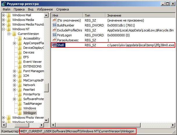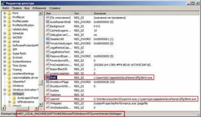В первую очередь нужно смотреть проблему в ветке реестра: HKEY_LOCAL_MACHINE\SOFTWARE\Microsoft\Windows NT\CurrentVersion\Winlogon смотрим строчку «shell» у неё должно быть значение «explorer.exe». А в нашем случае, вместо explorer.exe стоит значение c:\users\Ваше имя пользователя\appdata\local\temp\2fg38m0.exe ![]() Значит вместо рабочего стола Windows у нас загрузится вирус 2fg38m0.exe из папки временных файлов temp.