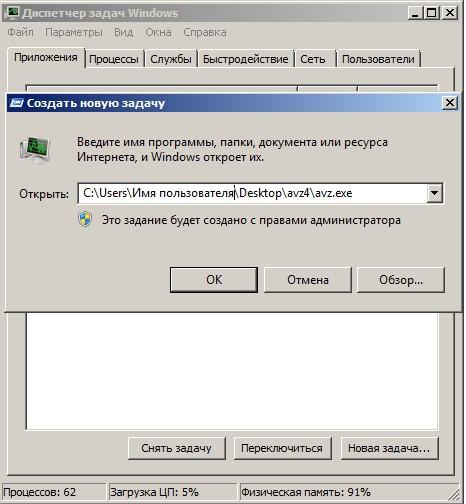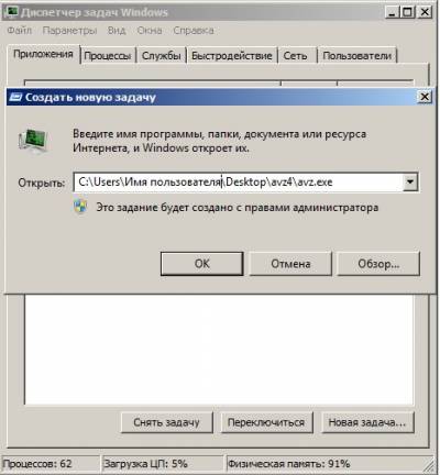 Здесь же, после проверки системных файлов, можно проверить реестр. В командной строке набираем regedit. Смотрим вышеуказанные ветки реестра. Утилита AVZ Хочу привести в пример всем известную утилиту AVZ. Если всё что сказано выше не поможет, можете применить данную утилиту. Идём на сайт разработчика утилиты – Олега Зайцева. http://z-oleg.com/secur/avz/download.php Скачиваем утилиту Вот здесь внимание, многие пользователи при запуске утилиты совершают ошибку. Нажимаем CRTL+ALT+DEL, появляется диспетчер задач, жмём Файл-> Новая задача, в открывшемся поле набираем полный путь до файла avz.exe. К примеру у меня файл avz.exe находится в папке C:\Users\Имя пользователя\Desktop\avz4\avz.exe