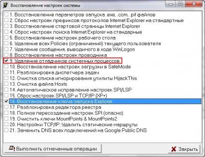 Файл->Восстановление системы ![]() Выставляем галочки на пункте 9. Удаление отладчиков системных процессов" и 16. Восстановление ключа запуска Explorer, далее нажимаем "Выполнить отмеченные операции". ![]() Перезагрузка. Ну вот пожалуй и всё. | |