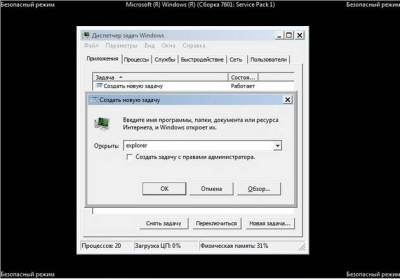 Ровно в половине случаев проблема будет решена и при следующей загрузке вы увидите свой рабочий стол, далее можно проверить систему на вирусы. Кстати, можете сразу вызвать в Диспетчере задач восстановление системы - Файл->Новая задача, вводим в поле ввода rstrui.exe, но это в Windows 7 и 8. В Windows XP нужно набрать %systemroot%\system32\restore\rstrui.exe