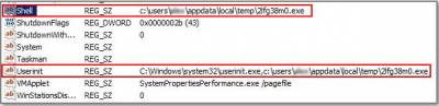 В этой же ветке смотрим ещё одну строчку «Userinit» у неё должно быть значение «C:\Windows\system32\userinit.exe», после запятой ничего не должно быть. В нашем же случае, опять присутствует значение c:\users\Имя пользователя\appdata\local\temp\2fg38m0.exe